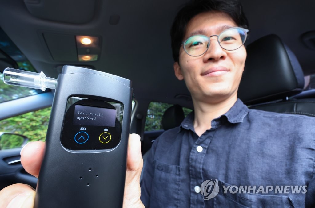 서울 서초구 도로교통공단서울지부에서 열린 음주운전 방지장치 시범운영 캠페인 행사에서 국민 체험단 관계자가 '운전 가능' 결과가 표시된 장치를 들어보이고 있다. 도로교통공단은 경찰청, 오비맥주, 센텍코리아, 디에이텍과 함께 국민 체험단 20명의 차량에 '음주운전 방지장치'를 설치하고 시범 캠페인을 시작한다고 밝혔다. 체험단은 본인 차량에 음주운전 방지장치를 설치해 3개월간 운행하게 된다. 수집된 데이터는 음주운전 방지장치의 국내 적용 방안 수립을 위한 연구 등에 활용될 예정이다.