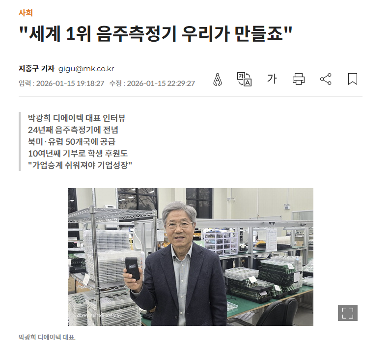 디에이텍(대표 박광희)은 음주운전 예방 기술 전문 기업이다. 2002년 창업해 24년째 음주측정기 분야 외길을 걷고 있다. 북미·유럽 등 50여 개국에 거래처가 있을 정도로 해외에서 인지도도 높다.